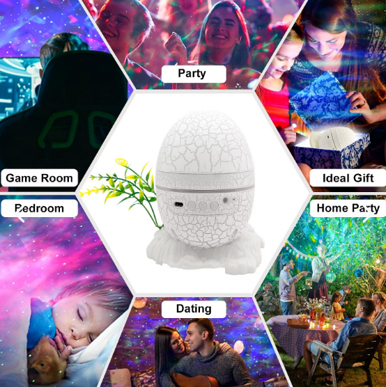 Transforma tu espacio en un mundo de fantasía con este adorable huevo de dinosaurio proyector, que combina luces estrelladas, nebulosas de colores y sonidos relajantes. Perfecto para crear una atmósfera única, tanto para dormir plácidamente como para ambientar tus momentos de descanso.